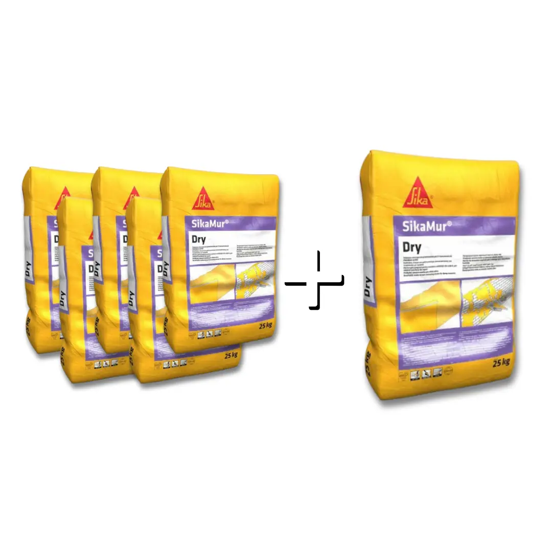 A csomag 6 db, egyenként 25 kg-os SikaMur Dry zsákot tartalmaz, 5 db termék áráért.
